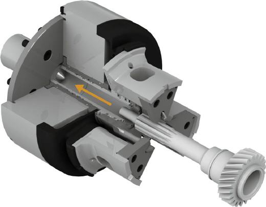 Durch die integrierte einstellbare Zentrierspitze wird das Werkstück radial abgestützt und axial positioniert. Die Werkstückspannung erfolgt radial entweder im Teilkreis der Verzahnung oder in Form einer Außenspannung. Ein standardisiertes Backensystem ist erhältlich. Das D-plus verfügt zudem über ein Anschlag- und Backenschnellwechselsystem und einen Fliehkraftausgleich.