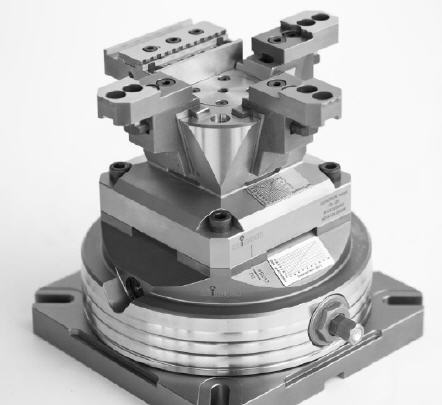 Praktischerweise kann die Betätigungseinheit permanent auf dem Maschinentisch montiert bleiben. Je nach Anforderung spannt der Anwender dann mit den unterschiedlichsten Backen-Konstellationen oder rüstet mit den entsprechenden Adaptionen auf Außen- oder Innenspannung um. Der Flexibilität sind keine Grenzen gesetzt. Und auch die Spannhöhe zeigt sich äußerst flexibel: Die niedrigste Werkstückauflage liegt bei den QUADROK-Spanneinheiten 120 und 200 bei 195 mm, bei der Dorn-Adaption zur Innenspannung bei 115 mm. Selbst bei großen Maschinentischen sind die fünf Seiten des Werkstücks so gut zu erreichen.
