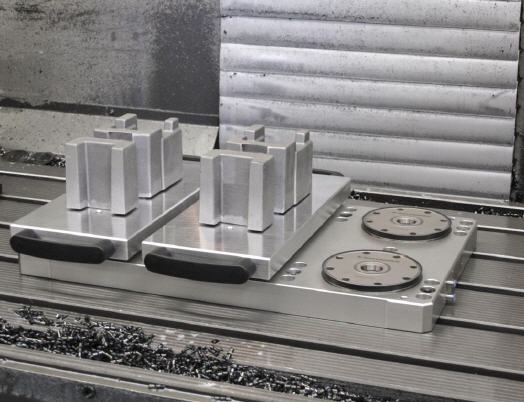 Speziell für die spanende Bearbeitung wurde das modulare, flexible Nullpunktspannsystem ›9000‹ entwickelt. Eine der Tischgröße und Bearbeitungsaufgabe angepasste Spannplatte wird direkt auf den Maschinentisch montiert. Für die Werkstückspannung werden einfach die bereits vorhandenen Spannmittel eingesetzt. Dazu werden diese entweder auf eine Palette montiert und einmalig ausgerichtet, oder direkt mit Zentrier-, Ausgleichs- und Spannzapfen versehen. Diese können wahlweise von oben oder unten verschraubt werden. Für die Horizontal-Bearbeitung werden Spanntürme eingesetzt, die eine kollisionsfreie Bearbeitung der Werkstücke ermöglichen. Auch die Spanntürme sind ebenfalls auf einer Palette mit Zentrier-, Ausgleichs- und Spannzapfen montiert.