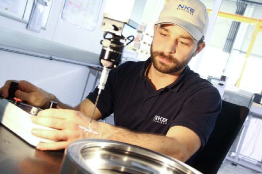 NKE fertigt Komponenten für Lager von 200 mm bis 800 mm Durchmesser am Firmenstandort in Steyr. Während und nach der Fertigung werden Güte und Geometrie der einzelnen Lagerkomponenten geprüft. Nach der Lagermontage wird am Prüfstand exemplarisch ein Funktionstest mit kompletten Lagern gemacht, um das Zusammenspiel der Komponenten und die Laufeigenschaften festzustellen.