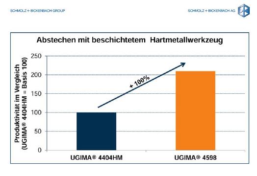 Der zerspanungsoptimierte UGIMA 4598 ist optimal geeignet für die Verarbeitung auf modernen CNC-Maschinen, die Zerspanungsgeschwindigkeiten von 14.000 rpm und mehr erreichen. Belastungstests bei der Fertigung von Schrauben an kaltgezogenen Stäben mit einem Durchmesser von 15 Millimetern belegen: Im Vergleich zum Standardstahl 1.4404 wird mit dem UGIMA 4598 unter Einsatz von Hartmetallwerkzeugen sogar eine Produktivitätssteigerung um bis zu 100 Prozent beim Abstechen des Stahls erzielt – ohne erhöhten Werkzeugverschleiß. Eine 80 Prozent höhere Produktivität erreichen Anwender beim Bohren des Stabstahls mit einem Durchmesser von sechs Millimetern.