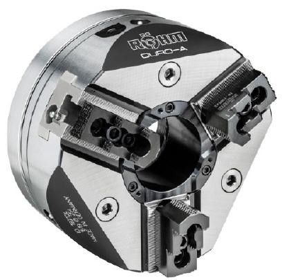 Das neue DURO-A Kraftspannfutter ergänzt als neues Mitglied der DURO Kraftspannfutter Familie das im letzten Jahr vorgestellte DURO-A RC Kraftspannfutter mit Backenschnellwechsel. Es überzeugt als Kraft-Champion mit konstanter Spannkraft über 500.000 Zyklen und bis zu 30 Prozent höherer Maximal-Spannkraft bei gleichzeitig zehn Prozent reduziertem Gewicht im Verhältnis zu vergleichbaren Kraftspannfuttern. Die konstante Spannkraft sorgt für eine sichere Spannung der Bauteile, womit sich auch höhere Werkstückgewichte bearbeiten lassen.