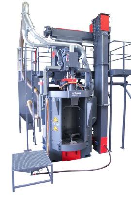Innerhalb der Statorträger-Fertigungslinie beansprucht die RWK 6/12-2 inklusive Teilezuführung, Roboter und einer Entleereinheit für Strahlmittel sowie einem kleinen Teilelager nur rund zehn Quadratmeter Fläche. Bearbeitet werden können bis zu 1.200 mm hohe Teile mit einem Durchmesser von maximal 600 mm. Zugeführt werden die Werkstücke von einer Entsandungsstation, in der anhaftender Sand größtenteils entfernt wird, über ein Förderband.