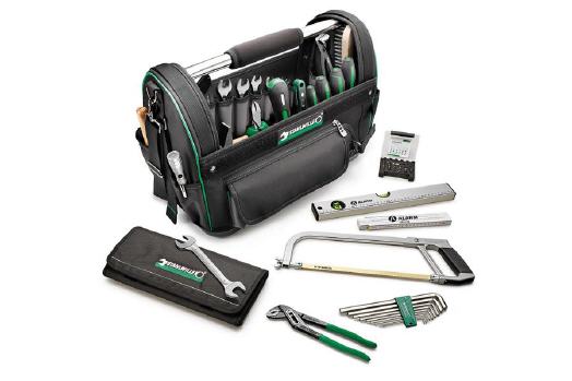 Zum Inhalt des Werkzeug-Sets für die Grundausstattung gehören unter anderem ein 10er Satz Doppelmaulschüssel mit gängigen Schlüsselweiten, fünf Schraubendreher mit ergonomischem Zwei-Komponenten-Handgriff, ein Winkelschraubendreher-Satz und eine Bit-Box mit Ratsche. Ergänzt wird das Set mit einem Schlosserhammer, verschiedenen Zangen, einer handlichen Metallsäge und einer Drahtbürste. Auch Mess- und Prüfmittel wie eine Wasserwaage, ein Gliedermaßstab und ein Spannungsprüfer gehören zum Set. Selbst an eine lichtstarke Teleskop-Taschenlampe ist gedacht.