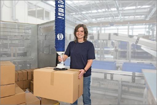 Ein Highlight von Schmalz ist der ›JumboFlex 50‹. Der Vakuum-Schlauchheber zur ergonomischen Handhabung kleinerer Lasten eignet sich immer dann, wenn im Logistikprozess Güter häufig und schnell umgesetzt werden müssen – beispielsweise Kartonagen, Fässer, Eimer, Säcke oder auch Kleinladungsträger.