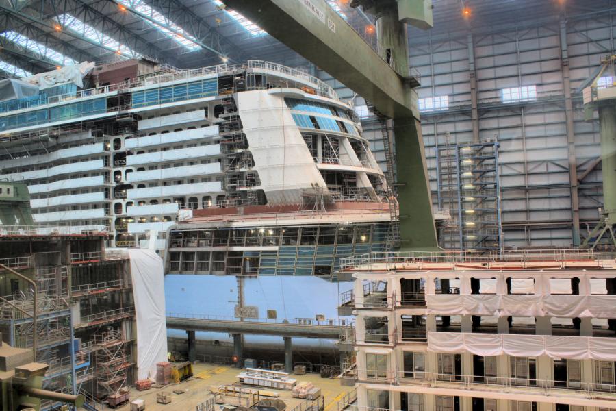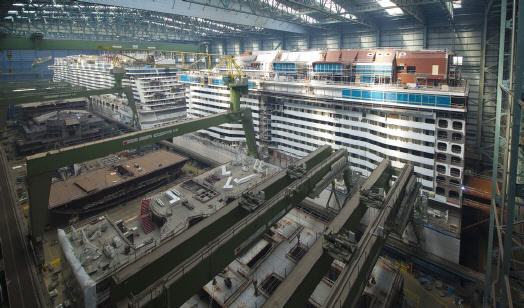 Auf diese effiziente Art und Weise werden sehr rasch mehrere Tausend Segmente und Einheiten produziert, die zusammengenommen die Kabinen, Speisesäle, Kinos, Wellnessräume, Theater oder Schiffskasinos ergeben und zusammengebaut nach Art eines überdimensionalen Lego-Baukastens ein Schiff von imposanter Größe ergeben, auf dem bis zu 4188 Passagiere Platz haben.
