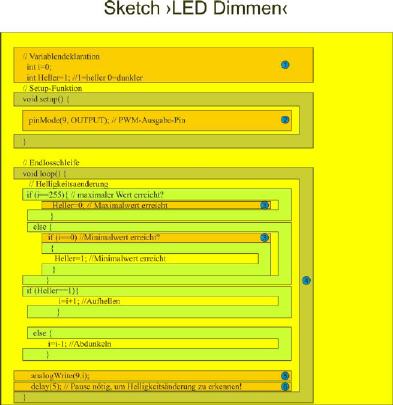 6. Der Pausenbefehl ›delay(5)‹ am Ende der Endlosschleife ist zwingend nötig, da sonst der Dimmeffekt nicht erkennbar ist. Grund: Der Arduino arbeitet die Schleife zu schnell für das menschliche Auge ab.