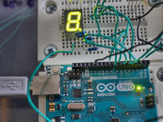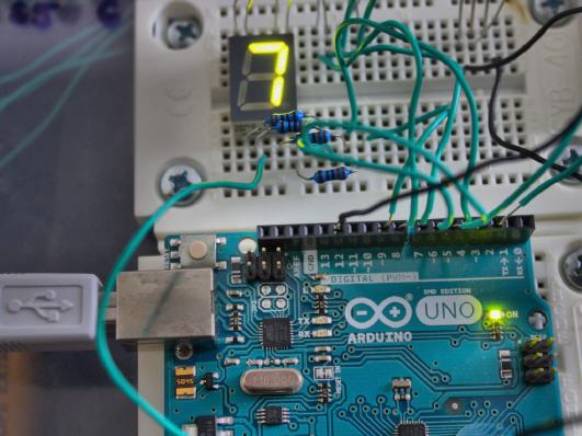 Um nun eine Siebensegmentanzeige mit dem Arduino anzusteuern, müssen lediglich diejenigen Pins auf High beziehungsweise Low geschaltet werden, die per Kabel mit einer der LEDs der Siebensegmentanzeige verbunden sind. Die Aufgabe ist demnach identisch zur Ansteuerung einer einzelnen LED, wie sie bereits in einem früheren Kursteil demonstriert wurde.