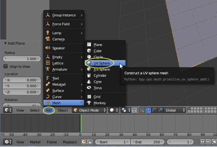 Eine Kugel wird in Blender über ›UV Sphere‹ erzeugt. Dieser Körper ist natürlich auch unter ›Mesh‹ zu finden. Die Kugel wird an die Stelle eingefügt, wo sich der 3D-Cursor gerade befindet. Daher kann es nötig werden, diese manuelle an die gewünschte Stelle zu verschieben. Dies geschieht entweder durch anklicken und Verschieben per Maus oder durch direktes Eingeben der gewünschten Koordinaten. Letzteres ist vorzuziehen, da das punktgenaue Platzieren im 3D-Raum seine Tücken hat. Für erste Versuche genügt es, den Z-Wert in Location auf 5 einzustellen. Die Kugel wird daraufhin in einen passenden Abstand zur Fläche verschoben.