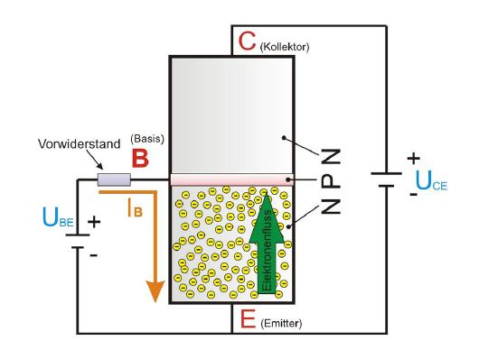 Die Basisspannung von 0,7 Volt bewirkt, dass Elektronen von der N-Schicht des Emitters zur P-Schicht der Basis wandern. Sie werden vom Plus-Pol der Spannung UBE angezogen. Dadurch, dass die P-Schicht nur sehr dünn ist, wird lediglich ein kleiner Teil der wandernden Elektronen in der P-Schicht weitergeleitet. Der größere Teil bewegt sich weiter in Richtung obere Grenzschicht, wodurch diese leitend wird. In der Folge zieht der Plus-Pol der Spannung UCE die Masse der Elektronen an und es fließt der Kollektorstrom IC. Etwa 99 Prozent der vom Emitter kommenden Elektronen wandern auf diese Weise zum Kollektor. In der dünnen Basisschicht fließt der Rest ab.