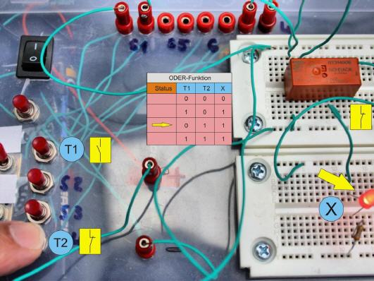 Im Gegensatz zur UND-Funktion ist es bei Nutzung der ODER-Funktion egal, welcher Taster gedrückt wird, um die LED zum Leuchten zu bringen.