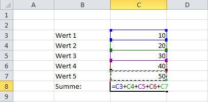 Es werden alle Zellen einzeln zusammengezählt. Dazu wird in die Zelle geklickt, in der später das Ergebnis der Summenberechnung stehen soll und dort das Ist-gleich-Zeichen (=) gesetzt. Danach werden nacheinander die Zellen angeklickt, deren Zahlen addiert werden sollen. Natürlich muss zwischen jedem Klick auf eine neue Zahl manuell das „+“-Zeichen zur entstehenden Formel hinzugegeben werden. Am Ende sollte die Formel ›=C3+C4+C5+C6+C7‹ stehen.