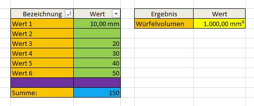 Soll beispielsweise das Volumen eines Würfels berechnet werden, so genügt es, in einer Zelle den Wert der Kantenlänge einzugeben und das Ergebnis in einer an beliebigem Ort befindlichen Zelle über eine Formel berechnen zu lassen.