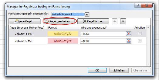 Sollen die Grenzwerte oder die Farben geändert werden, so kann dies über ›Regeln verwalten…‹ geschehen.