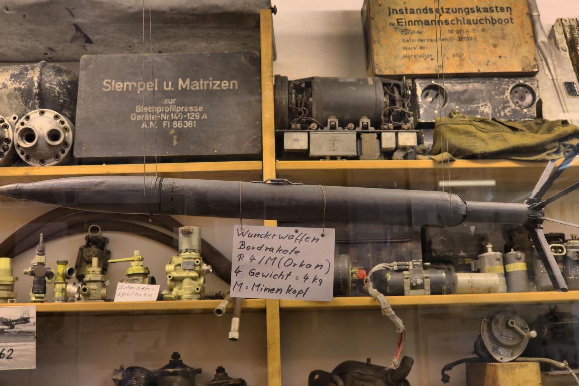 Wer bisher dachte, dass Raketen, die von Flugzeugen abgeschossen wurden, eine Erfindung der Nachkriegszeit sind, der sollte die in der Nähe zum Me 262-Flügel befindliche Vitrine aufsuchen, in der sich ein weiteres Highlight befindet, das zur Me 262 gehörte und unbedingt besichtigt werden sollte: eine R4M-Rakete.